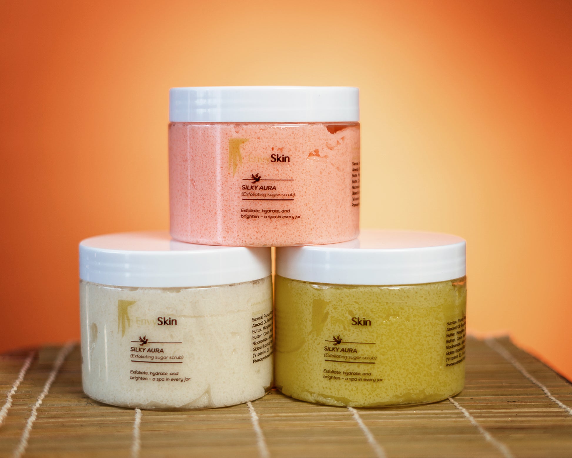 Indulge your skin in pure luxury with SILKY AURA, a creamy, exfoliating sugar scrub crafted to buff away dullness while deeply nourishing and brightening the skin.